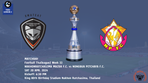 การแข่งฟุตบอลไทยลีก2 ฤดูกาล2023/24 สัปดาห์ที่ 33 นครราชสีมา มาสด้า เอฟซี พบ หนองบัว พิชญ เอฟซี วันเสาร์ที่ 20 เมษายน 2567 เวลา 18:30...