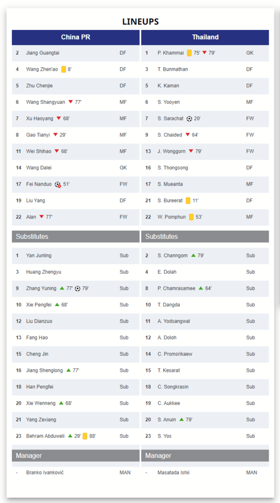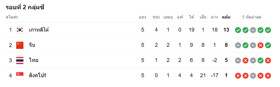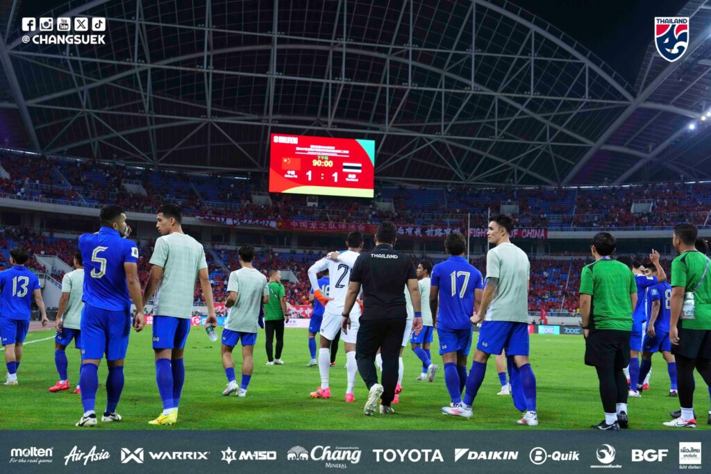 วันที่ 6 มิถุนายน 2567 ทีมชาติไทยบุกไปเยือนทีมชาติจีน ในศึกฟุตบอลโลกรอบคัดเลือกโซนเอเซีย รอบ 2 ในนัดที่ 5 ทีมชาติไทย เปิดเกมบุกเพื่อหวังคว้า 3 แต้ม โดยที่ทีมชาติไทยได้ประตูนำจาก สุภโชค สารชาติ นาทีที่ 20 ก่อนที่ทีมชาติจีนมาตีเสมอในนาทีที่ 79 จาก เบห์รัม อับดูเวลี ภาพรวมครึ่งแรกทีมชาติไทยเปิดเกมรุก โต้กลับ ได้อย่างสนุก และได้ลุ้นโอกาสการทำประตูแต่น่าเสียดายที่ไม่ได้ประตูเพิ่ม และในครึ่งหลังทีมชาติจีนต้องการประตูจึงเล่นเกมรุกเต็มที่ และด้วยอาการบาดเจ็บของนักเตะไทย อย่าง ศุภชัย ใจเด็ด , ปฏิวัติ คำไหม โดนเปลี่ยนตัวออก ทำให้ความน่ากลัวลดลงไปบ้างและผู้เล่นที่เปลี่ยนตัวลงมาก็ไม่สามารถสร้างผลที่แตกต่างได้เปรียบ จบเกมจึงเสมอกันไปแบ่งไปทีมละ 1 คะแนน ไทยยังมีโอกาสเข้ารอบถ้านัดสุดท้าย เอาชนะ สิงคโปร์ ให้ได้ก่อนเงื่อนไขแรก โดยที่ต้องยิงประตูให้ได้อย่างน้อย 3 ประตู และ เกาหลีใต้ต้องเอาชนะจีนให้ได้